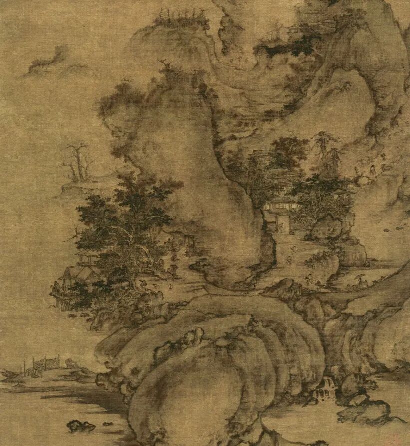 《山村图》是一幅山水笔法苍润、人物刻画细致的佳作。图中主峰峥嵘巍峨,山腰处烟霭浮动,山下巧妙设置了晒网的渔夫、闲坐的高士、归家的权贵与赶路的行旅四组人物,展现出不同阶层的迥异生活状态。此图不仅山石林木笔墨精妙,点景人物更是传递出丰富的民俗与史料信息,整体意境雍容典雅,内容富有情趣,值得细细品读赏鉴。